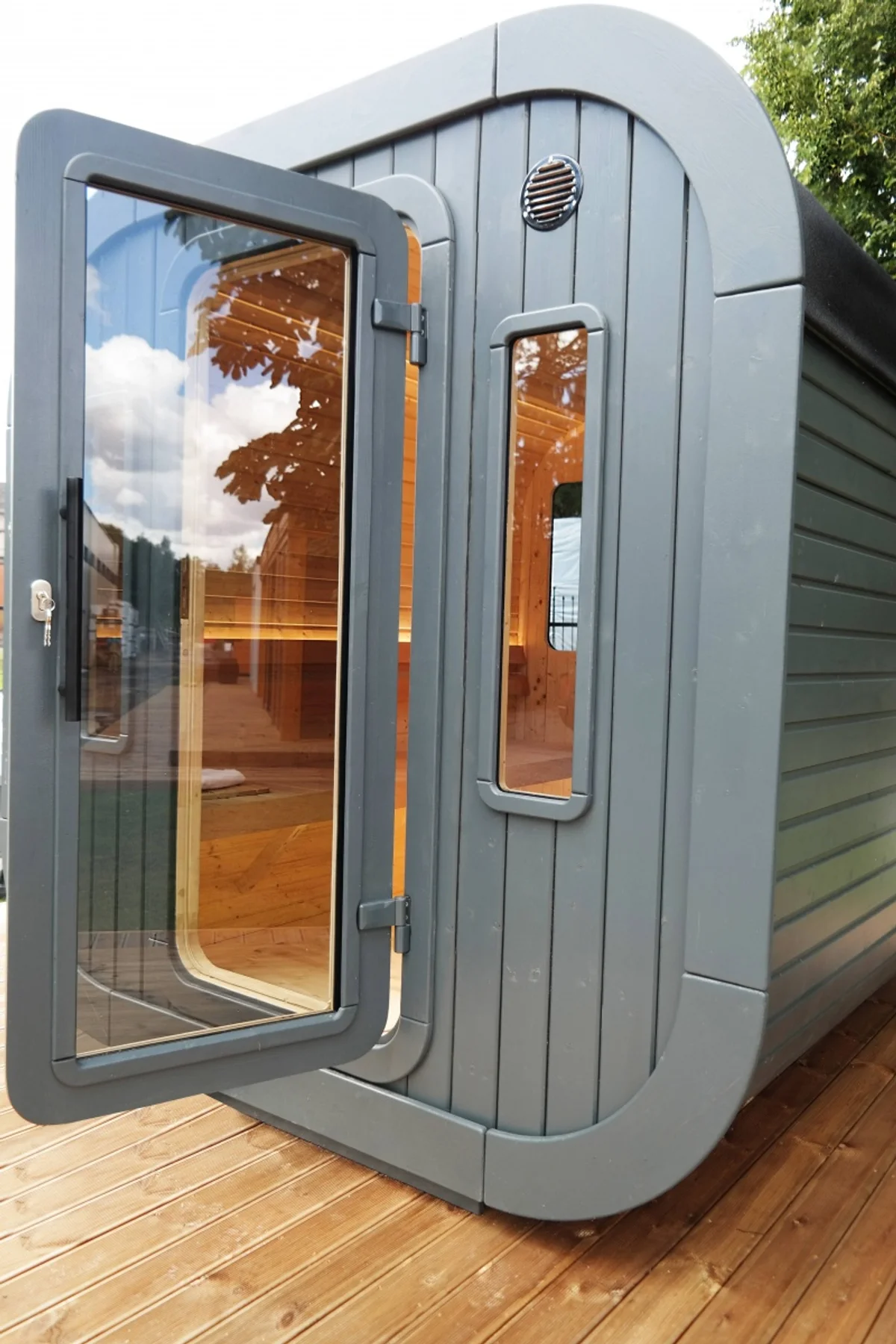 The Lux model blends elegant modern design with superior thermal insulation and premium interior finish. Built with 125 mm insulated walls, 100 mm rock wool, and vapor barrier, the sauna includes tempered glass windows and doors, dark-stained seating, and a Harvia wood-burning stove. Delivered fully assembled with high-end finishing and four windows for enhanced natural light.
