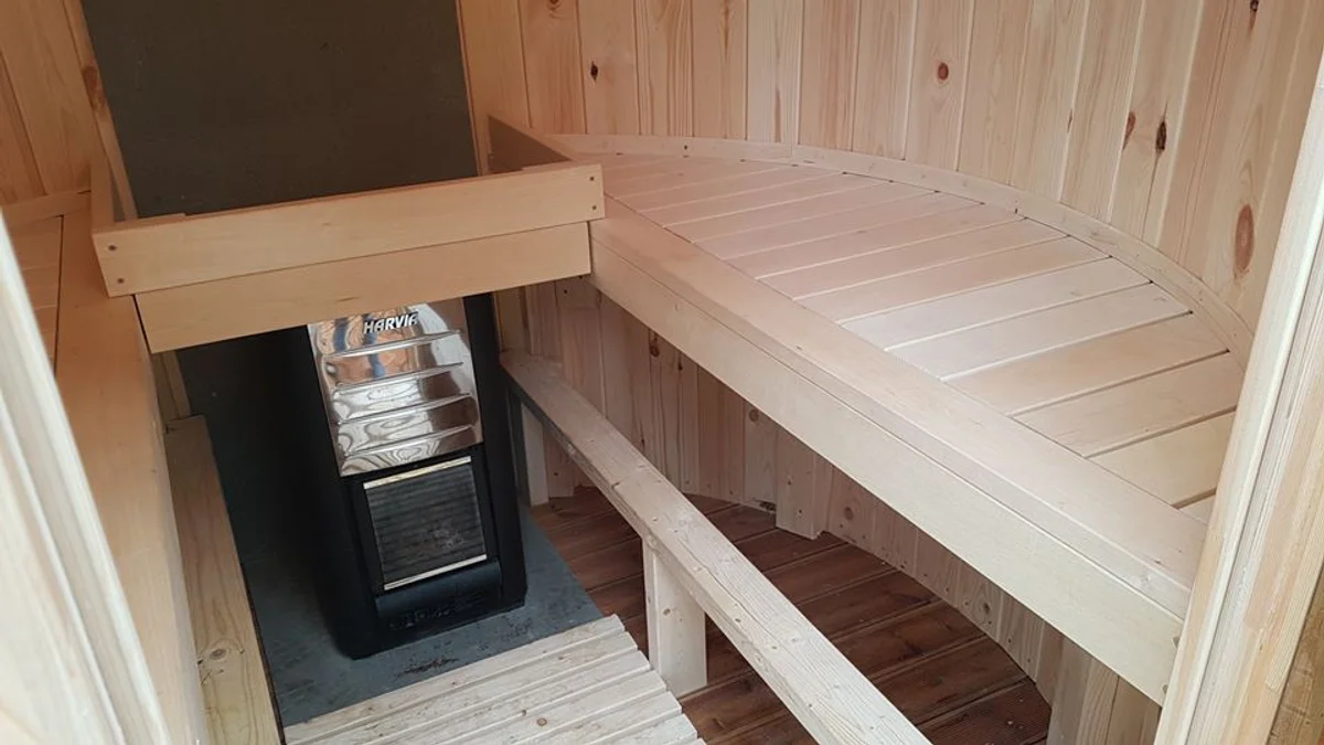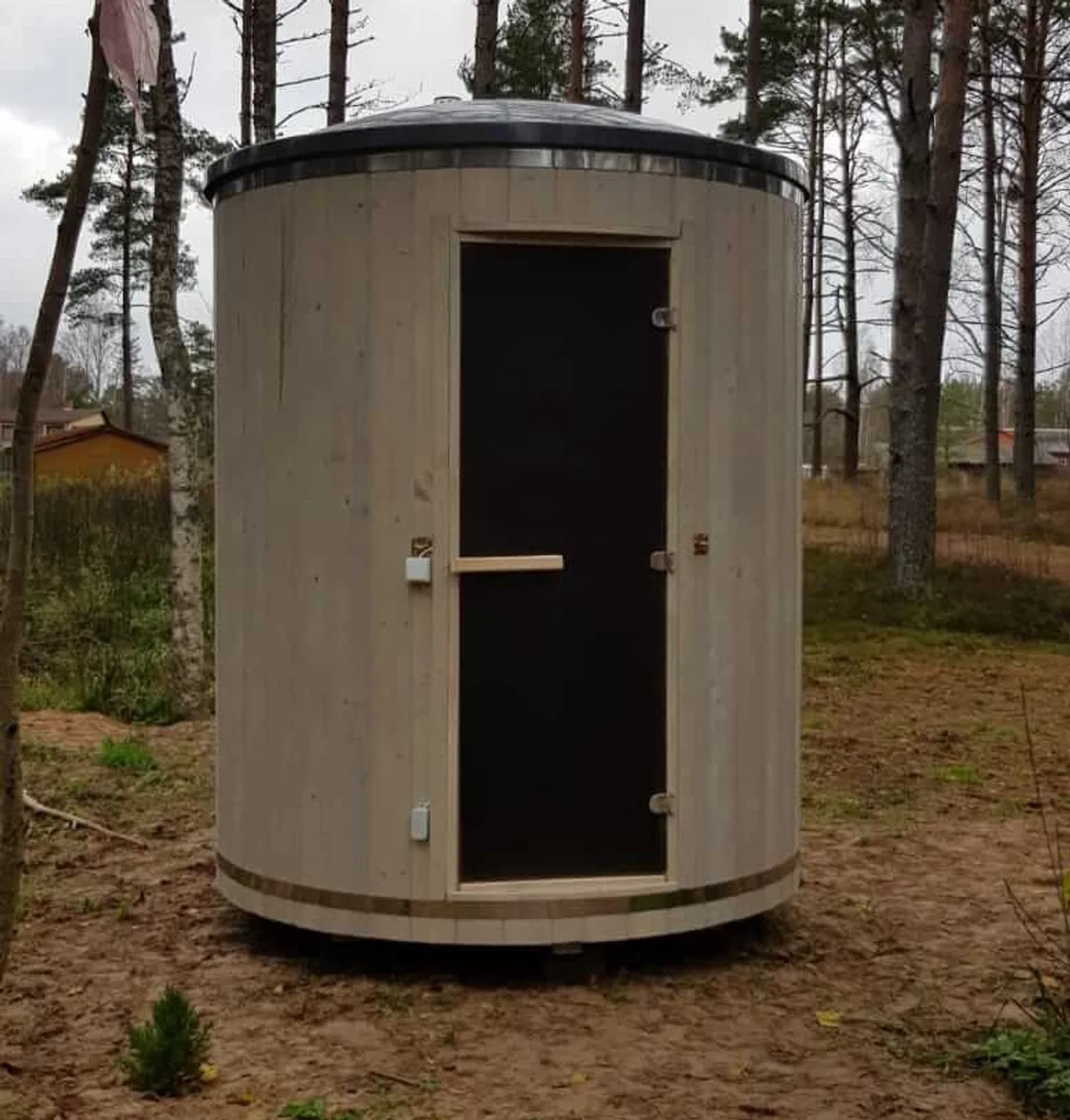 Plaša apaļā pirts ar 3.90m garumu un 2.35m diametru, ietver 2.30m pērtuvi un 1.16m priekštelpu. Aprīkota ar Skamet malkas krāsni, melnalkšņa lāviņām, rūdīta stikla durvīm, divkāršiem pakešu logiem, LED apgaismojumu un bitumena šindeļu jumtu. Izgatavota no 45mm termokoka.