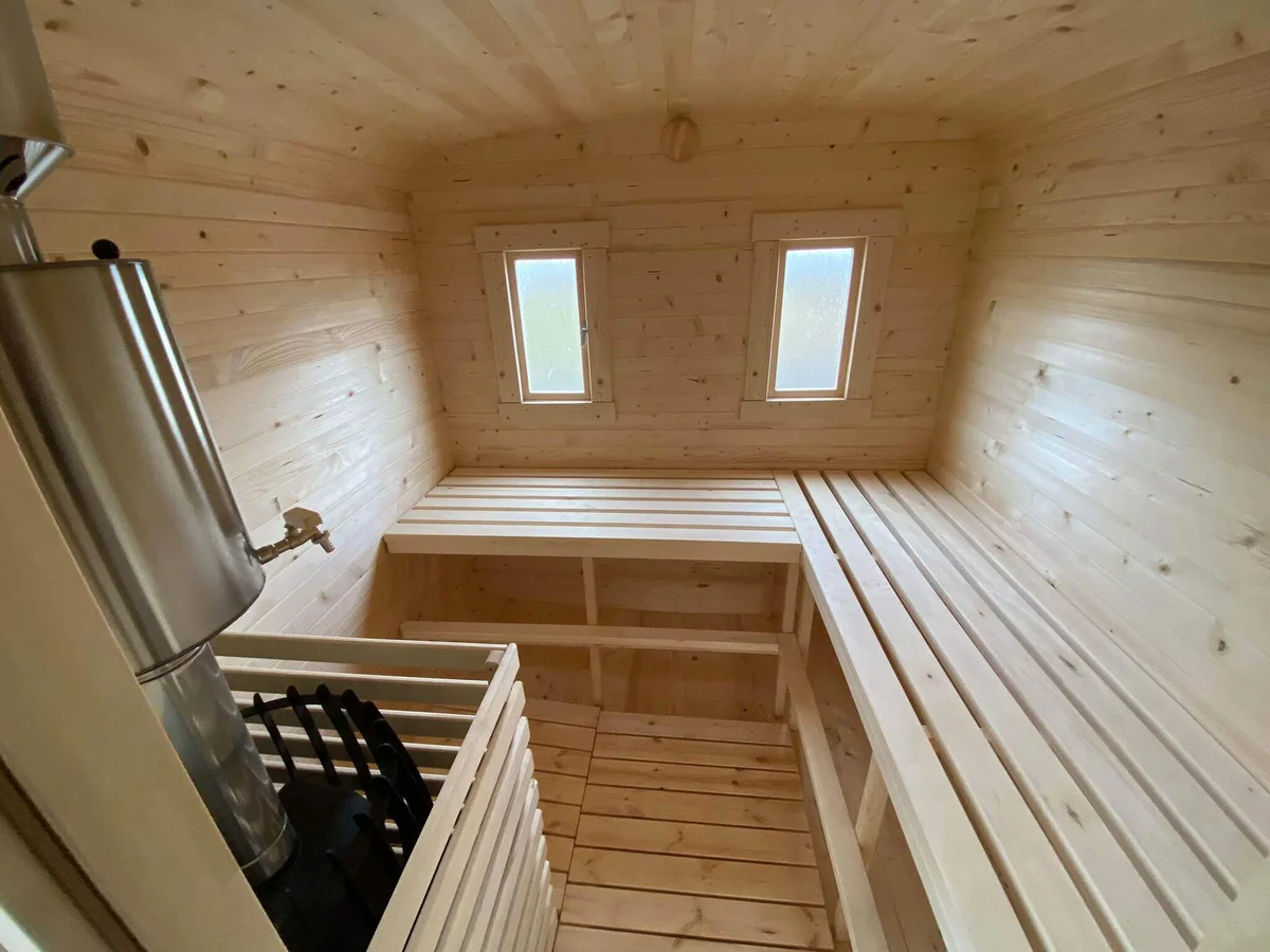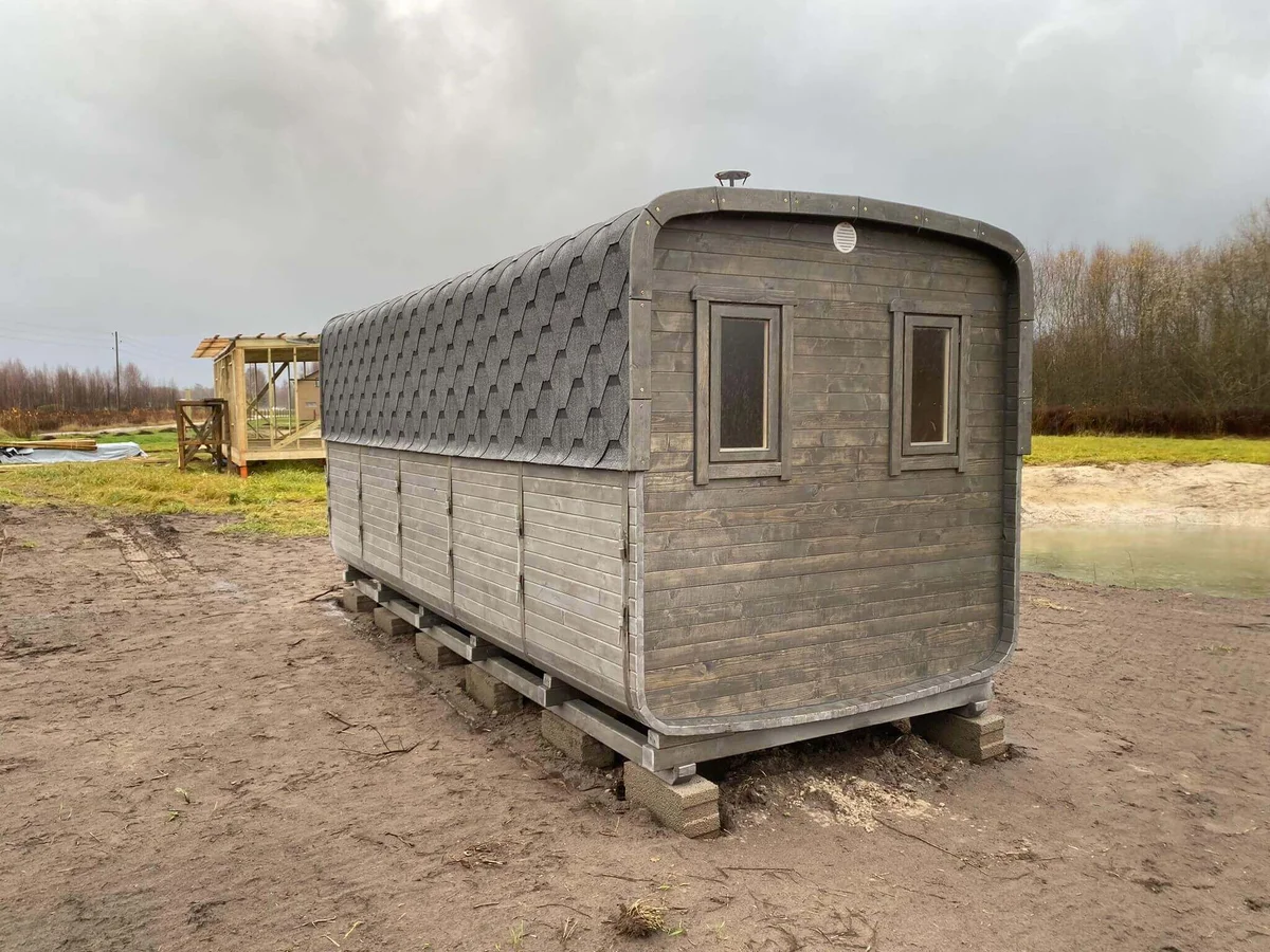 Просторная круглая сауна длиной 3.90м и диаметром 2.35м, включает парную 2.30м и предбанник 1.16м. Оснащена дровяной печью Skamet, лавками из ольхи, закалённой стеклянной дверью, двухкамерными окнами, светодиодным освещением и крышей из битумной черепицы. Изготовлена из термодерева толщиной 45мм.