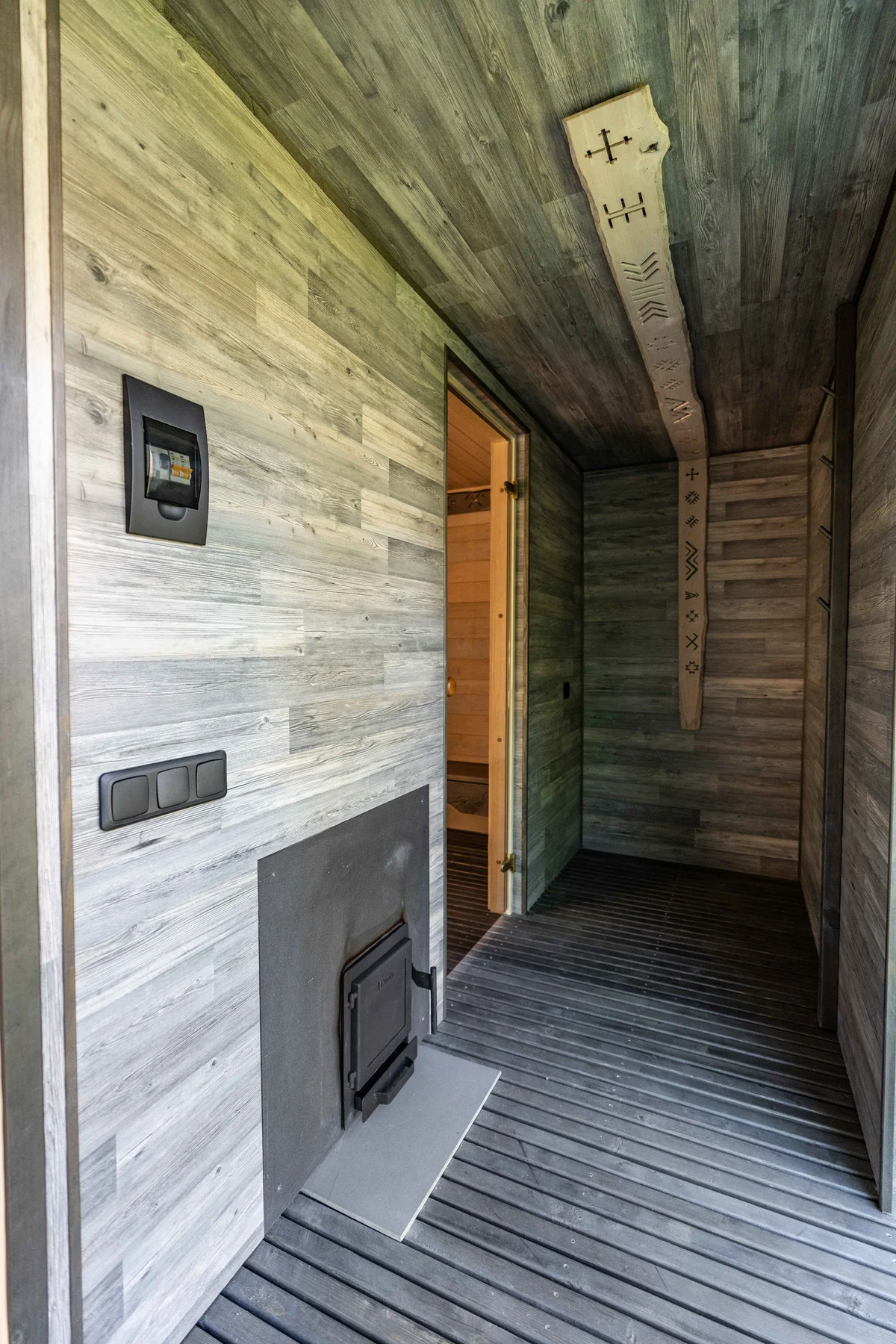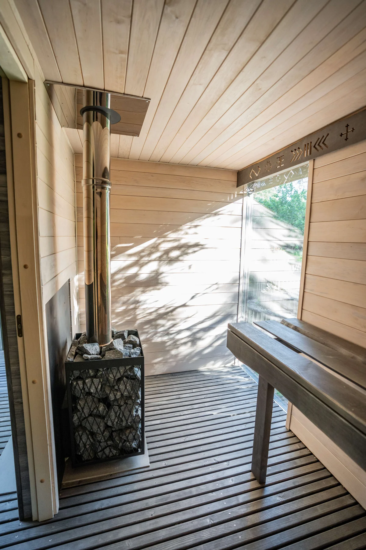A compact and modern 9 m² sauna made from 45x95 mm calibrated timber and insulated with 100 mm mineral wool. Designed for outdoor placement in gardens or near terraces. Features high-quality graphite exterior cladding, white-toned linden wood sauna interior, foil-reflective thermal insulation, LED lighting, and a wood-fired stove. Large panoramic window in the sauna room and a bitumen roof. A compact and modern 9 m² sauna made from 45x95 mm calibrated timber and insulated with 100 mm mineral wool. Designed for outdoor placement in gardens or near terraces. Features high-quality graphite exterior cladding, white-toned linden wood sauna interior, foil-reflective thermal insulation, LED lighting, and a wood-fired stove. Large panoramic window in the sauna room and a bitumen roof.