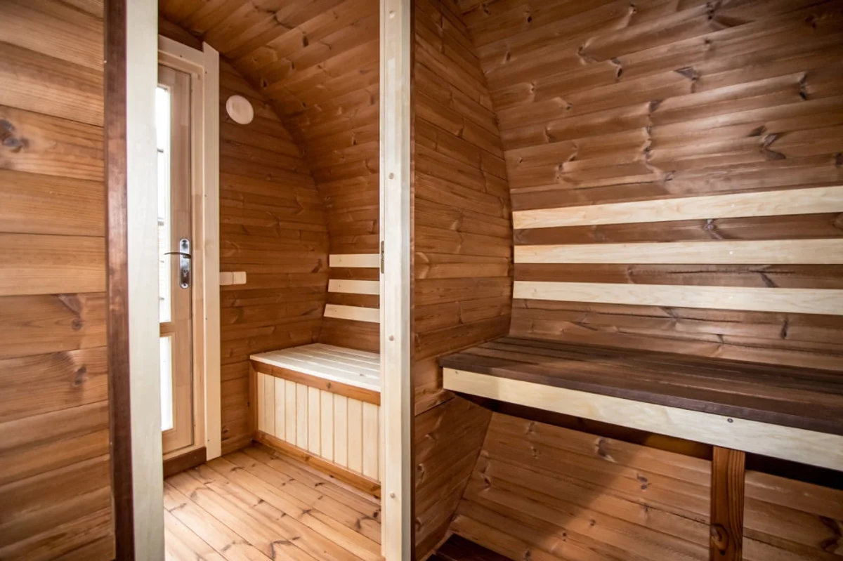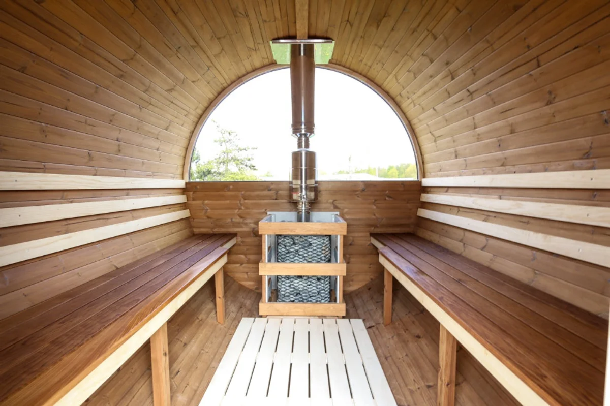 A large barrel-style outdoor sauna with a total length of 5.9 m and diameter of 2.27 m, suitable for 8–10 people. Constructed from 46 mm thick pine boards and equipped with a Harvia Pro 20 (24.1 kW) wood-burning stove. Features two rooms, tempered glass doors and windows, a 0.6 m terrace, and delivered pre-assembled.