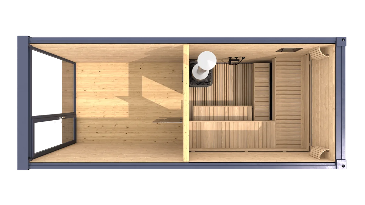 Профессиональная прямоугольная сауна, построенная внутри морского контейнера и оптимизированная для латвийских банных ритуалов. Комфортно вмещает 6–8 человек; двое могут лечь во весь рост на верхней лавке 215×80 см. Дровяная печь с бойлером 60 л. Полная теплоизоляция, светодиодное освещение, вентиляция, встроенный душ в парной и просторная предбаня. Поставляется готовой к транспортировке и быстрому монтажу у дома, на мероприятиях или на коммерческих площадках.