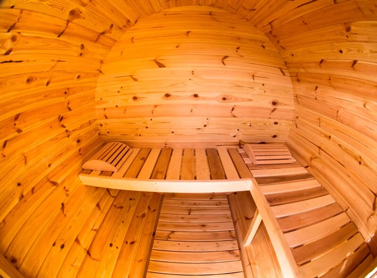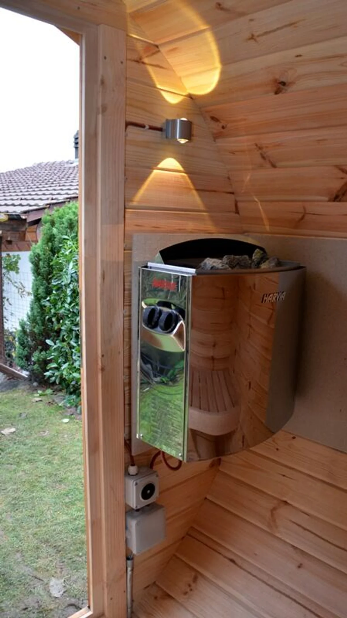 Компактная уличная баня-бочка длиной 1.7 м и диаметром 1.97 м. Построена из строганных сосновых досок толщиной 46 мм, скреплённых металлическими обручами. Включает электропечь Harvia Vega BC80 (8 кВт), крышу из битумной черепицы, стеклянную дверь и поставляется в собранном виде.